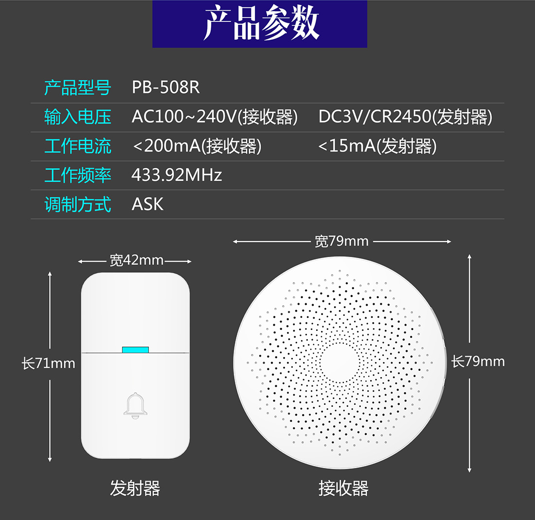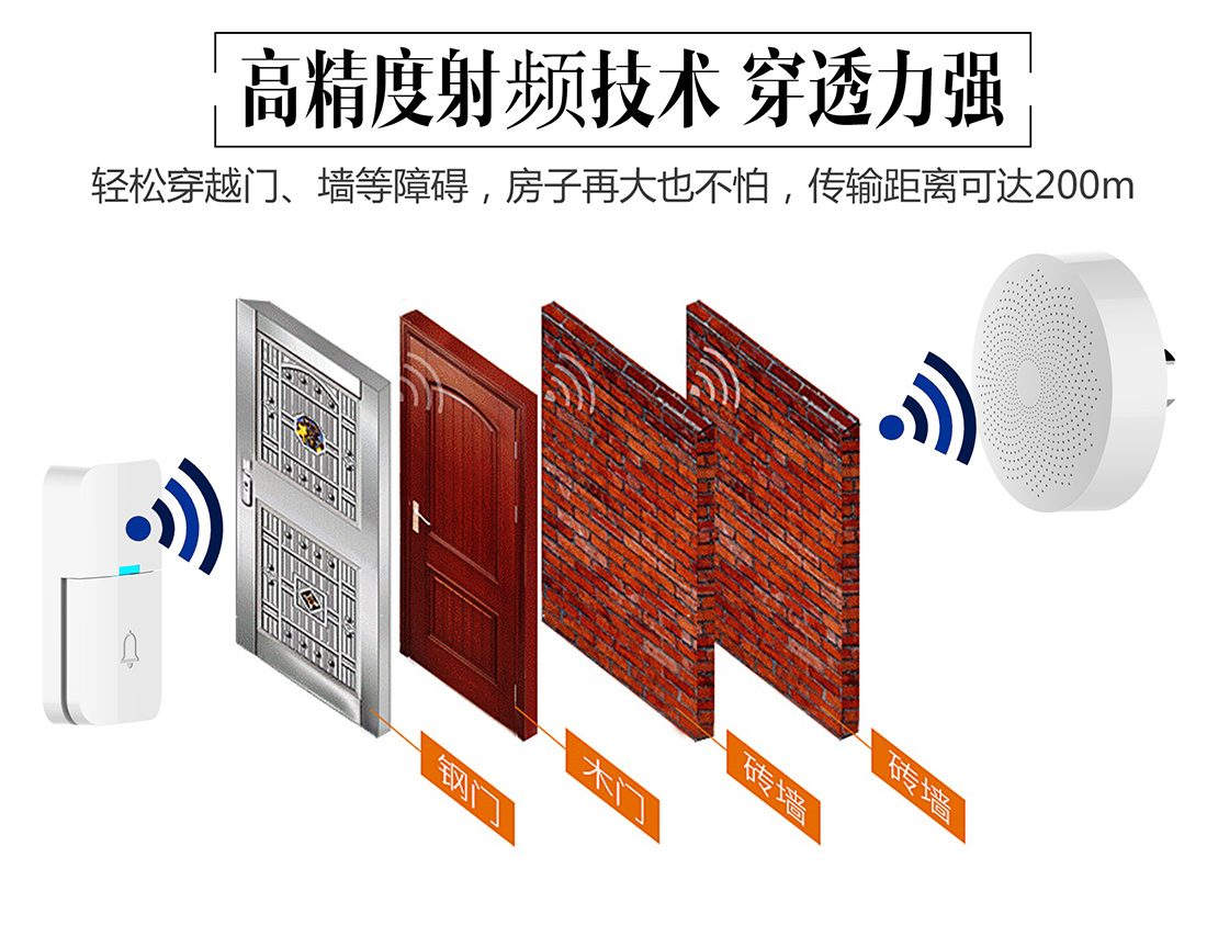 本无线门铃PB-701R采用了采用了先进的无线高频发射接收技术,强大的微电脑控制系统,大容量的高质量的语音处理技术,集成多达58首和弦音乐,音量4级可调,传输距离高达200m,性能稳定可靠。门铃主机和门铃按钮可以无线对码。适合别墅、会所、休闲中心、酒店、宾馆、家庭、写字楼、会议室等场所。
