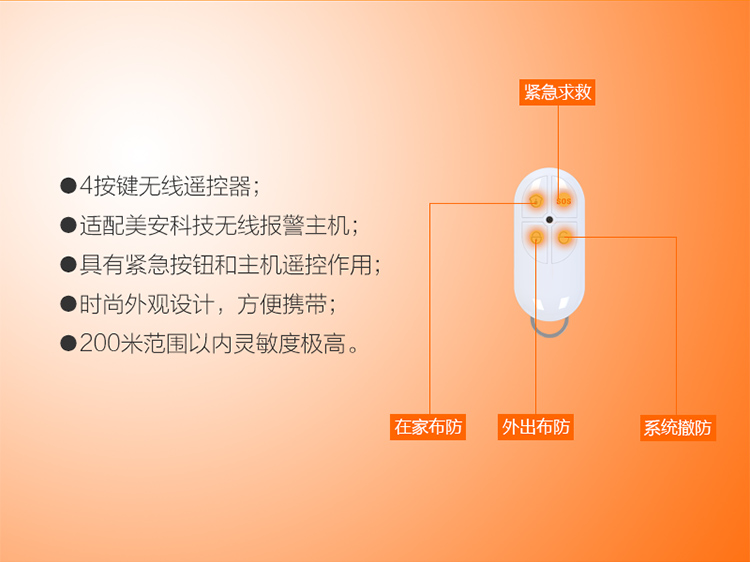◎ 4按键无线遥控器; ◎ 适配美安科技无线报警主机; ◎ 具有紧急按钮和家庭自动化主机遥控作用; ◎ 时尚潮流外观设计,既可做装饰品也方便携带; ◎ 200米范围以内灵敏度极高。
