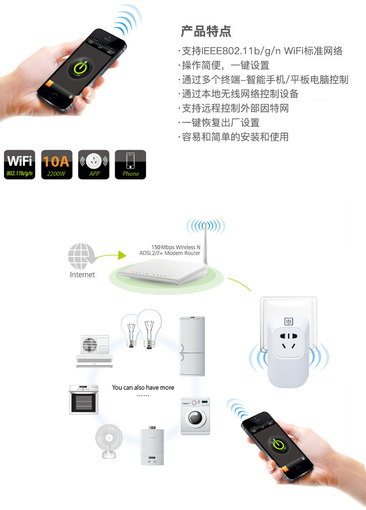 1.WIFI智能插座 支持APP远程控制 2.智能插座语音控制,只需几秒家电变智能,远程控制,定时开关,750℃阻燃。 3.只要您处在WIFI环境中在任何地方开关电器。 4.模块系统,您可随时轻松添加其他插座。 5.您可以随心所欲控制您的家电,支持多手机控制一个插座,支持一个手机控制多个插座。 6.直观、简易的设置。