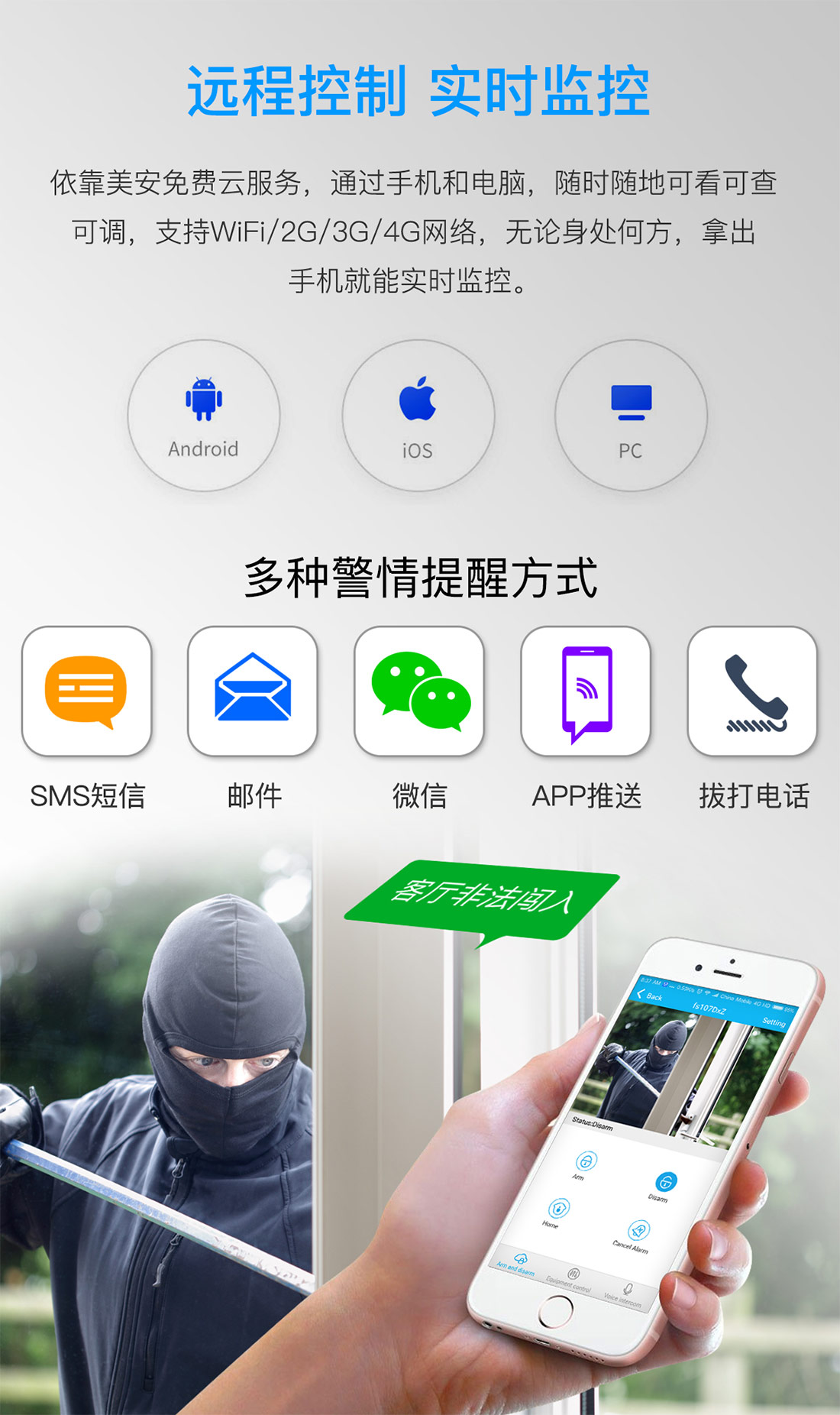 支持短信布撤防、状态查询、电器开关控制、可编程输出口控制 |