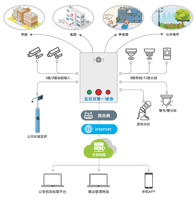 校园一键式紧急报警系统美安科技基于云计算、物联网技术、移动互联网技术为一体的专门适用于在校人员紧急求救的视频报警联网平台。
